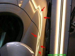 Zur besseren Darstellung des Schadens wurden einige der Fotos mit der Reflektion einer Ausbeullampe gemacht. Wie Sie auf den nachfolgenden Fotos sehen können wurde auch das Seitenteil so ausgebeult, das es nicht lackiert werden musste, obwohl sehr viele Dellen darin waren. Die Kante war großflächig gequetscht, es war eine scharfkantige Delle drin sowie mehrere Stellen mit Wellen im Material. Eine echte Herausforderung also.