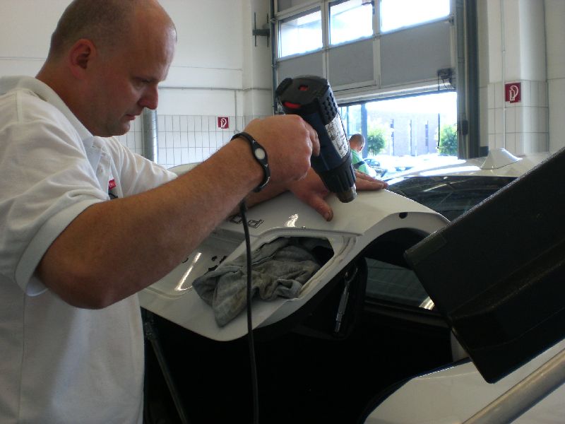 Während der Heißkleber trocknet, wird an anderer Stelle bereits weiter ausgebeult.